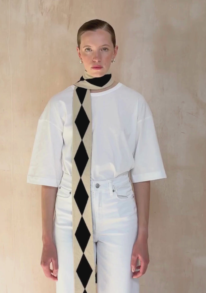 In a season of layering, the smallest pieces can make the biggest entrance. Inspired by vintage showmanship and made from buttery-soft merino wool, this TBCo skinny scarf in a black and cream diamond harlequin pattern is a playful twist on tradition. Lightweight and breathable, it’s perfect for the season shift – the kind of scarf you forget you’re wearing, until someone compliments you on it.