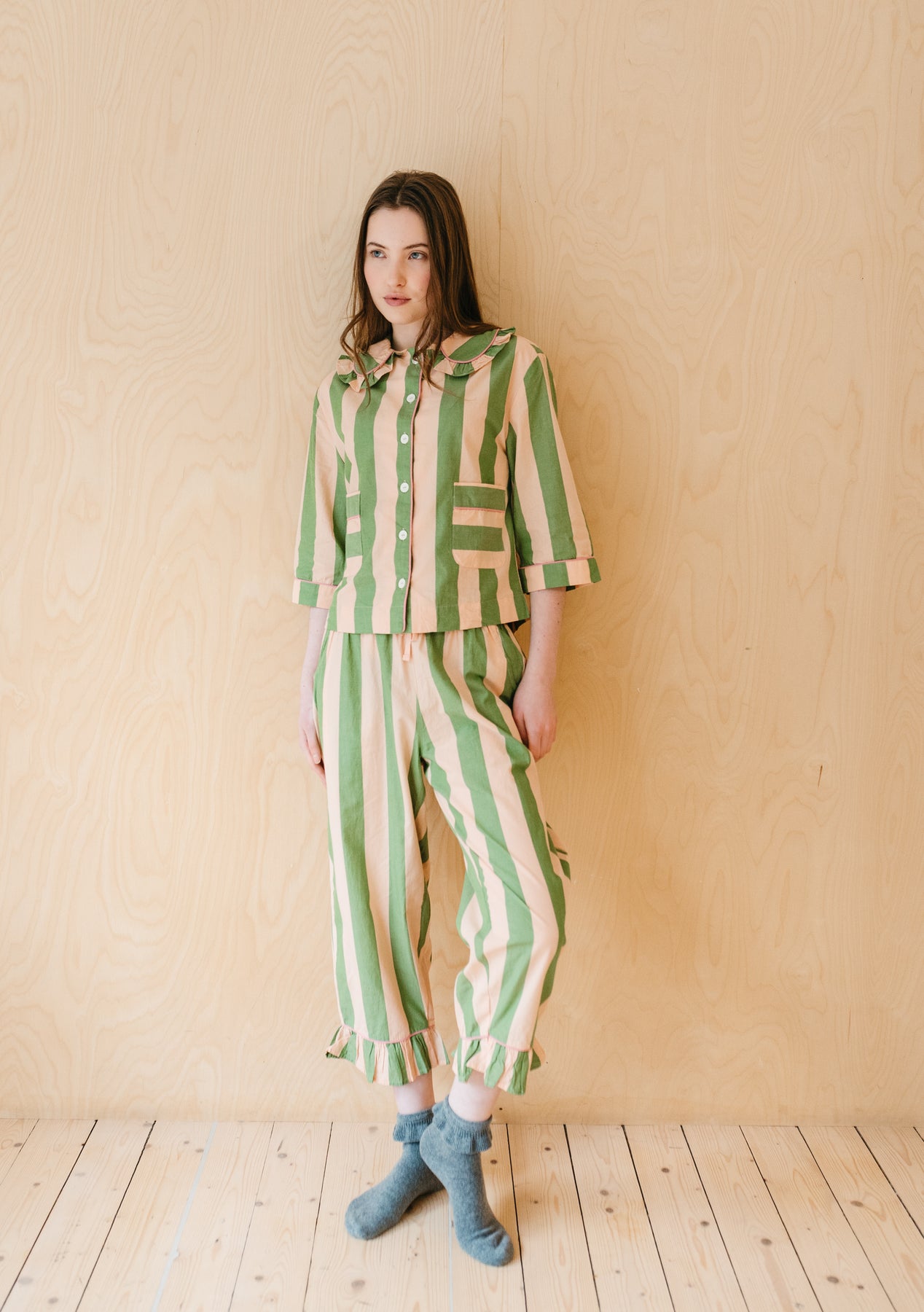 Remember when you sold out our green stripe bedding in less these two weeks? We've we've taken the excess fabric from our bedding collection and created these PJs in your favourite pattern, and we've thought of everything. The drawstring is stitched into the comfortable elastic waist so that you'll never lose it. The ruffled collar and trim means you'll never hide behind the door again when your takeaway arrives. The cropped sleeves means they won't get wet when you wash your face. The buttons are made from recycled materials. The 100% cotton is breathable, keeping you at the perfect temperature while you snooze. Best of all these, PJs are available in a matching kids set.