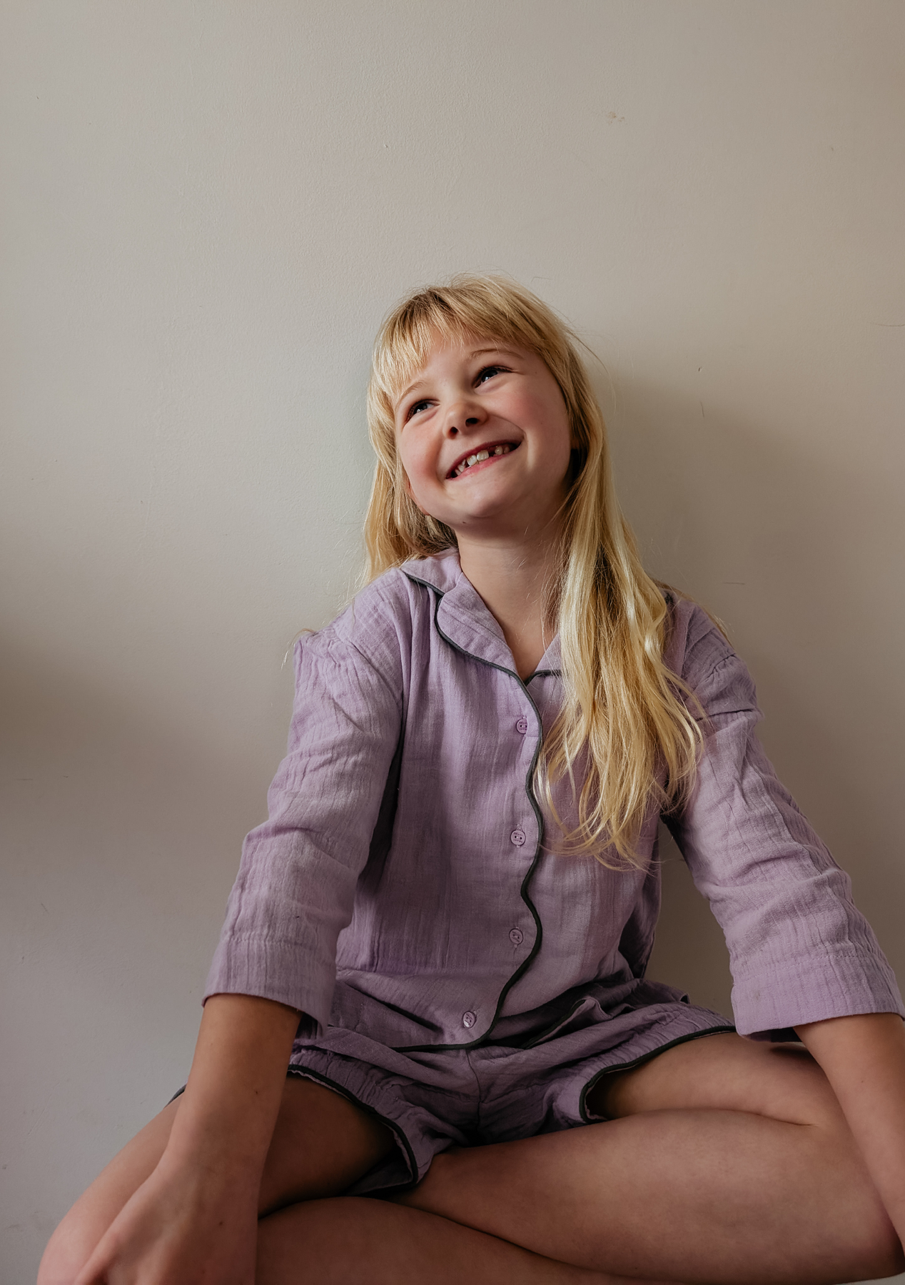 Designed for comfort and style, this lilac kids’ pyjama shorts set is made from 100% high-quality cotton gauze. Featuring contrast green piping, playful scalloped edges, cropped sleeves, a relaxed fit and breathable fabric, these PJs ensure a cosy night's sleep while being gentle on young skin.