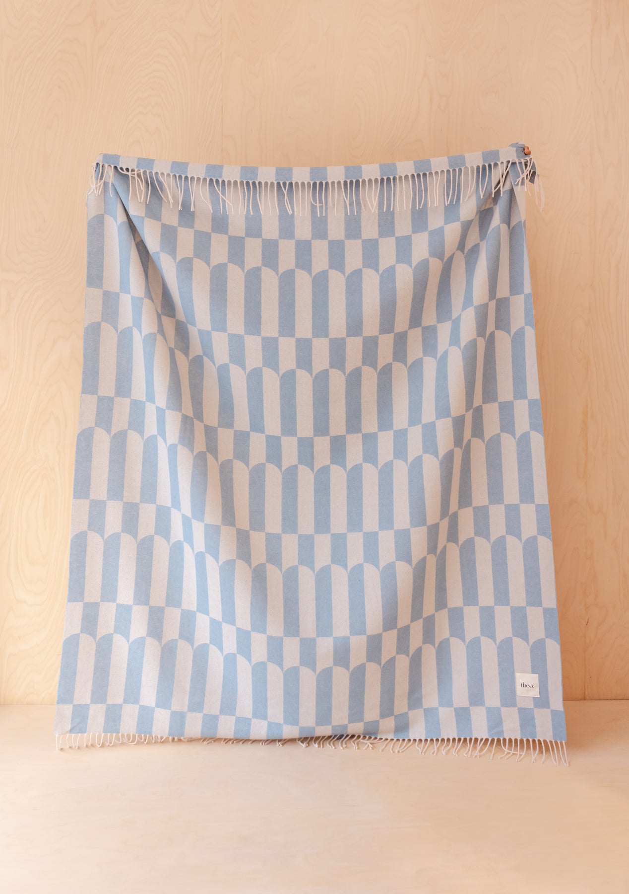 Folded Lambswool Blanket in Blue Geo by TBCo with fringe detail and soft blue geometric arch pattern on pale wood background