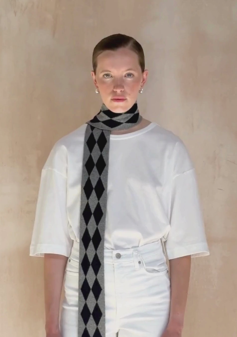 En cette saison où les superpositions sont omniprésentes, les plus petites pièces peuvent faire une entrée remarquée. Inspirée du style vintage et confectionnée en laine mérinos douce comme du beurre, cette écharpe fine TBCo, ornée d'un motif arlequin à losanges gris anthracite et bleu marine, revisite la tradition avec humour. Légère et respirante, elle est parfaite pour les changements de saison : le genre d'écharpe qu'on oublie jusqu'à ce qu'on nous la complimente.
