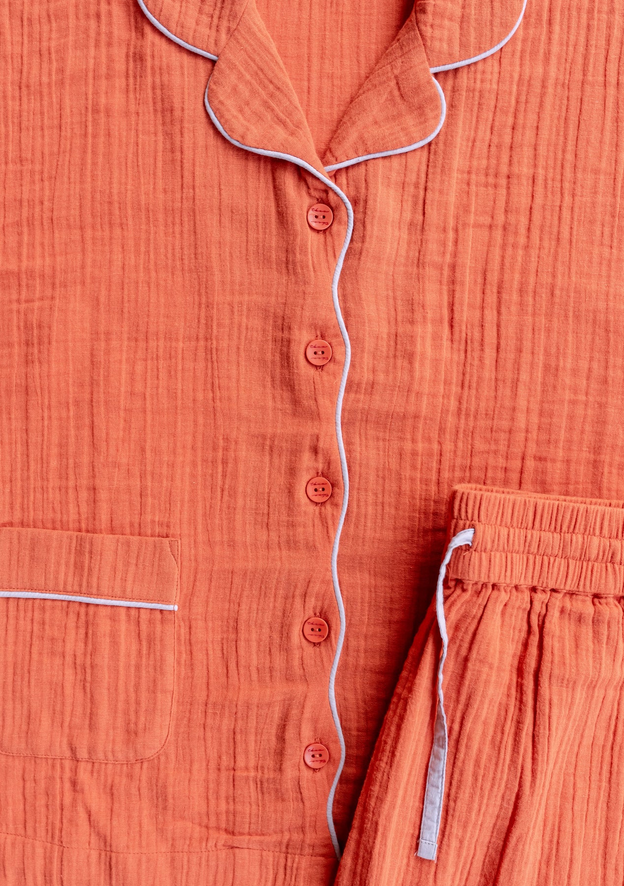 Love my pjs, they are so comfortable! The fabric is soft and light so I don’t overheat in them. The rust colour is very cute with contrasting lilac scalloped detail. I like the short sleeves and loose fit. I gifted the pjs in other colours to my sister in law and my son’s girlfriend who are also very happy.