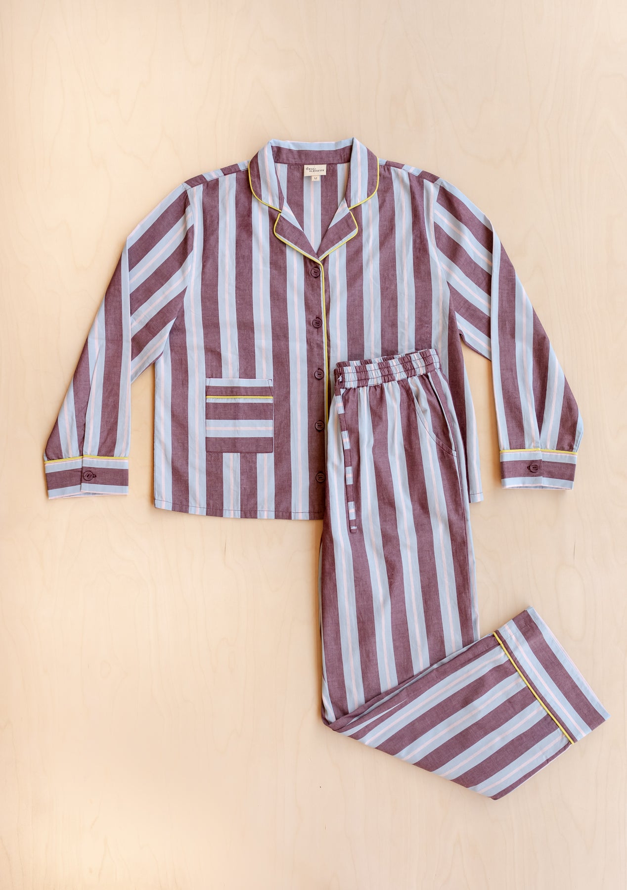 Confectionné en coton 100 % respirant, cet ensemble pyjama joyeux arbore de larges rayures verticales bordeaux et bleues, rehaussées d'un liseré vert citron contrastant. Doté de poches pratiques sur le haut et le pantalon, ainsi que d'une taille élastiquée pour un confort optimal, ce pyjama sera aussi agréable à porter au petit-déjeuner qu'au lit. Un chouchou assorti et un sac en coton à cordon sont également inclus, parfaits pour le ranger lors de vos voyages.