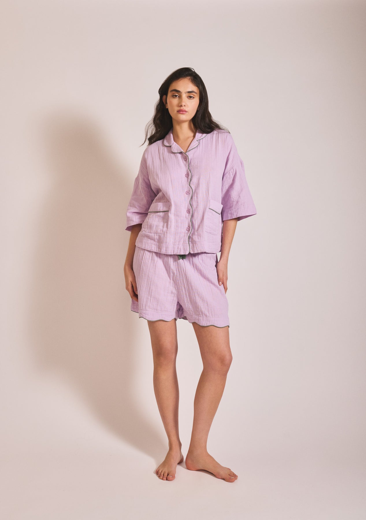 Enfilez ce pyjama en coton lilas au design parfait, rehaussé d'un passepoil vert contrastant. On a pensé à tout ! Le cordon de serrage est intégré à la taille élastiquée confortable pour ne jamais le perdre. Les manches courtes restent au sec même après s'être lavé le visage. Les boutons sont fabriqués à partir de matériaux recyclés. La gaze de coton froissée est respirante et vous assure une température idéale pour un sommeil réparateur. Le bord festonné du short est adorable. Et parce qu'on adore les poches, il y en a deux sur le haut.