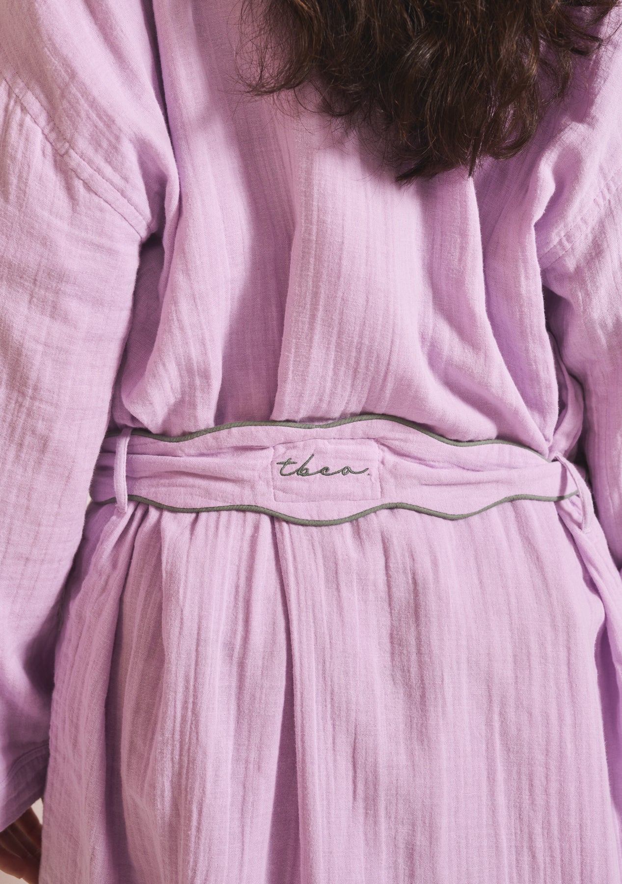 Ce peignoir lilas, confectionné en gaze de coton 100 % de haute qualité, offre une sensation de douceur et de respirabilité. Sa coupe ample et ses bords festonnés créent une pièce à la fois élégante et confortable, idéale pour se détendre. Portez-le avec le pyjama assorti ou seul.