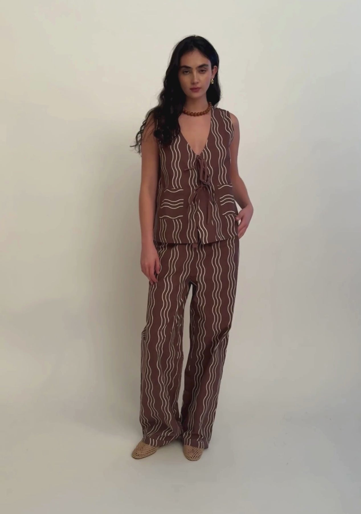 These comfortable trousers in a wavy brown and ecru stripe pattern are crafted from 100% high-quality cotton. Featuring an elastic waistband, drawstring tie details for an adjustable fit and two hip pockets, they pair perfectly with our matching vest top for a put-together look. The soft and breathable fabric ensures a relaxed and comfortable feel.