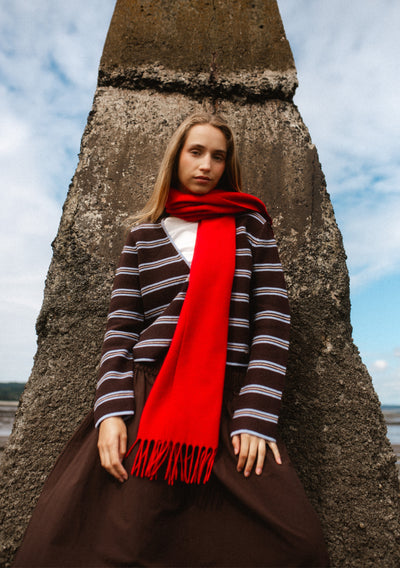 There's a reason triangle scarves are our bestseller. Easily add interest and confidence to your outfit with this camel and apricot edged triangle scarf knitted from soft and warm merino wool with an embroidered TBCo logo. It can be tied in multiple ways for endless styling options. Read more on our blog here.